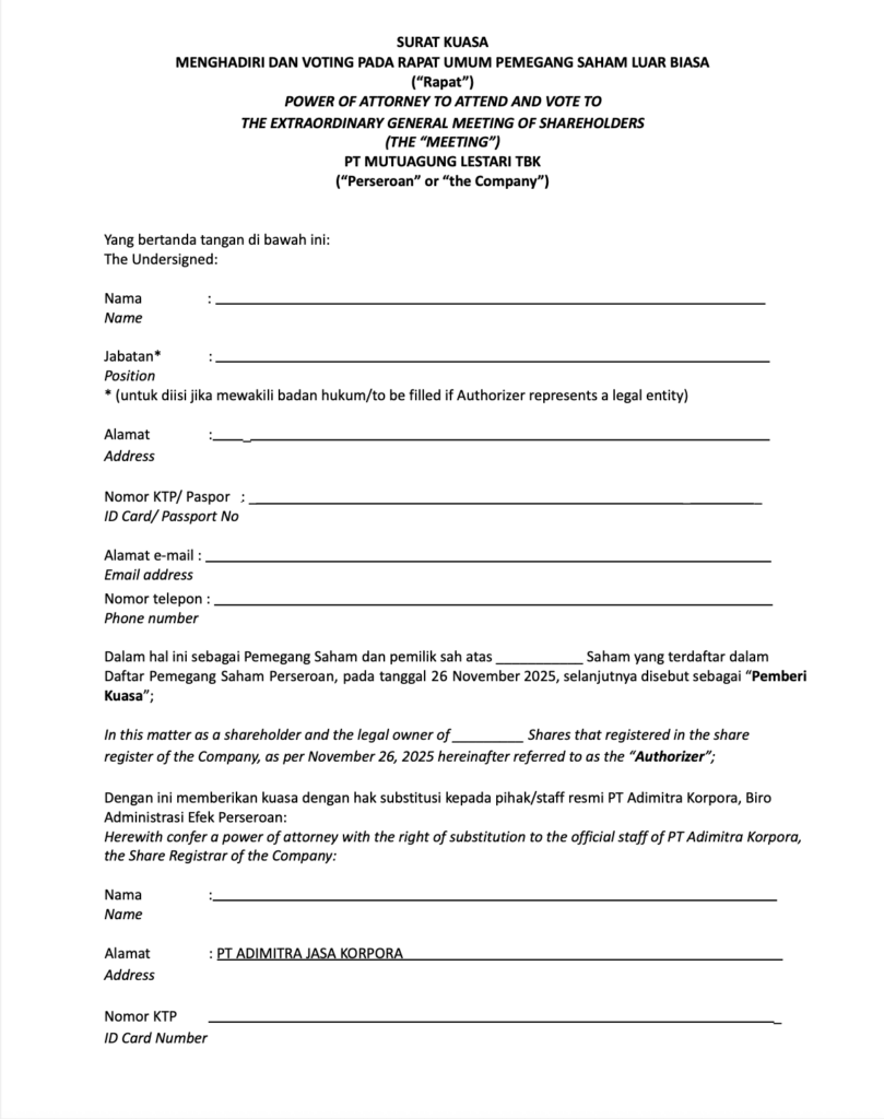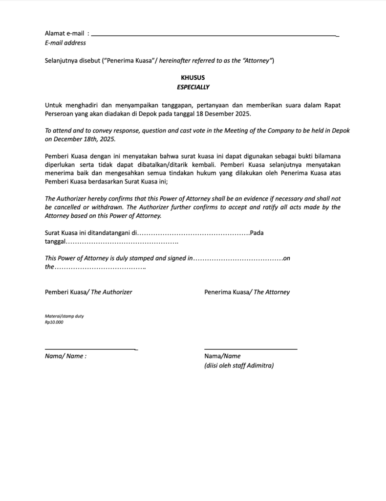 02 Des Surat Kuasa Menghadiri Voting RUPS tanggal 18 Desember 2025 Posted at 17:03h in Uncategorized by Fariz Cahyo 0 Comments 0 Likes File dapat di download di sini